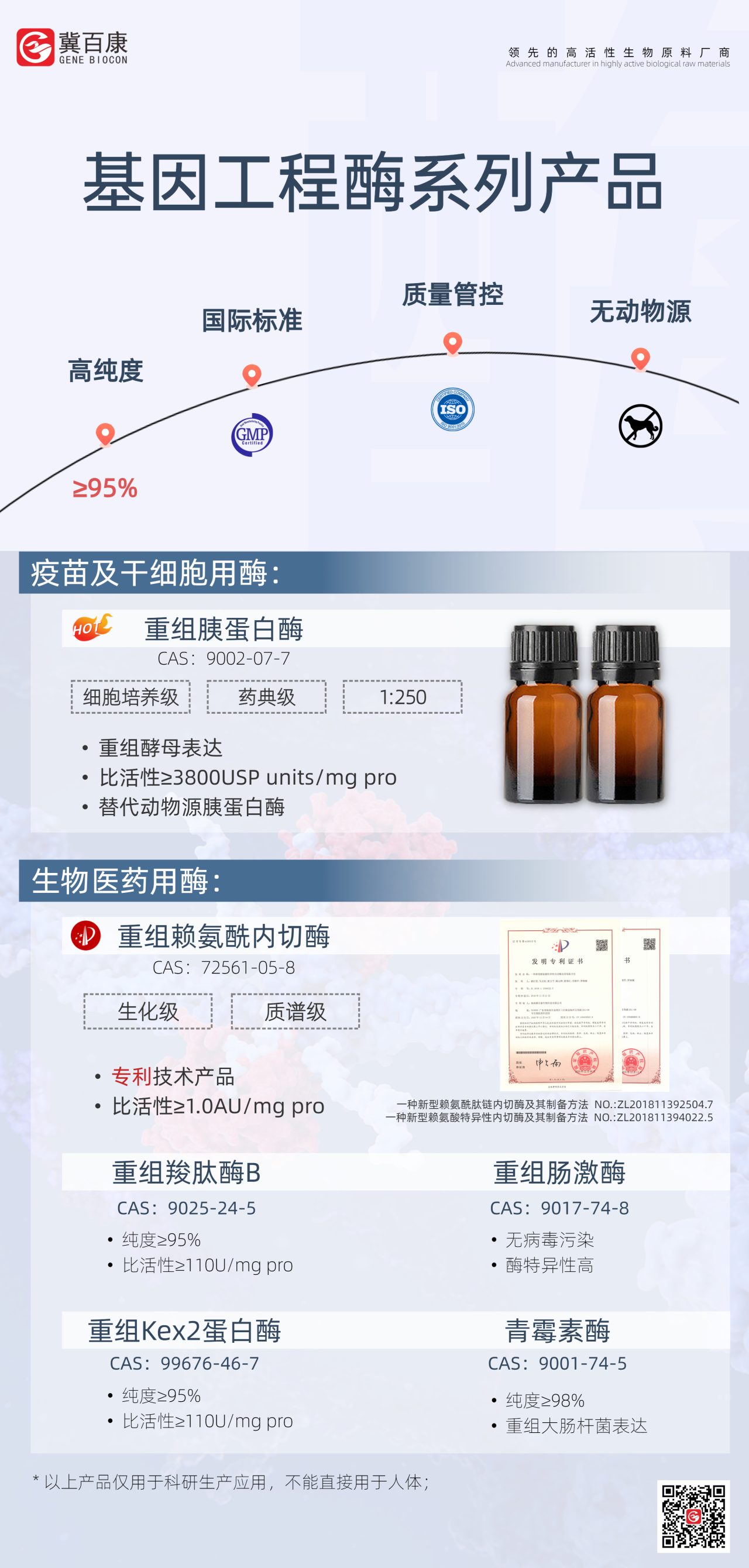 通過冀百康生物特有的基因技術(shù)平臺,實現(xiàn)重組羧肽酶B比活性>180U/mg pro.,并實現(xiàn)大規(guī)模生產(chǎn),滿足市場對高純度、高活性酶制劑的需求。